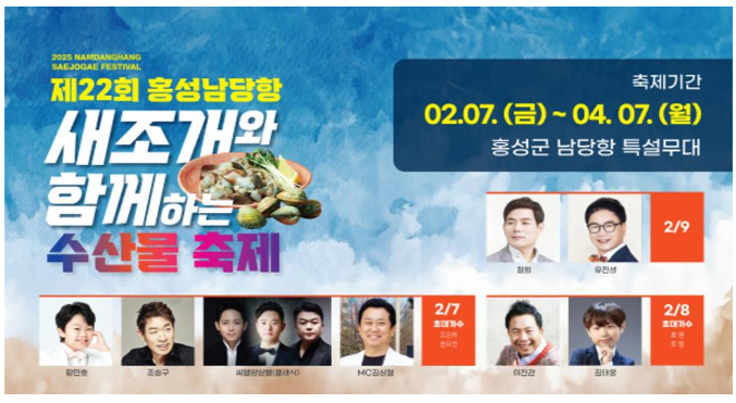 올해는 2월 7일부터 4월 7일까지 진행되는 이 축제에서 여러분은 맛있고 신선한 새조개를 즐기며, 겨울철 바다의 아름다움을 만끽할 수 있을 것입니다. 홍성 남당항의 매력에 빠져보세요.