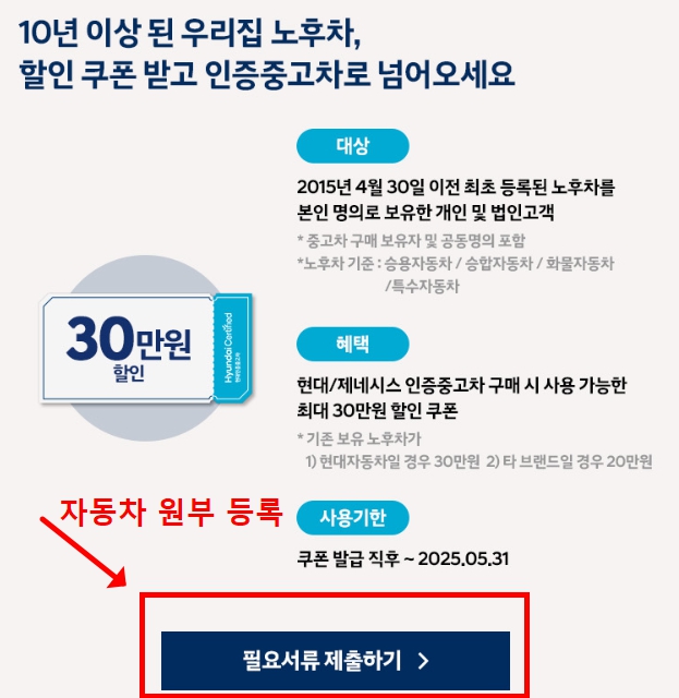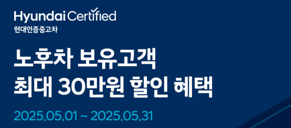 2025년 5월 한 달간 현대자동차 인증중고차 공식 홈페이지에서는 ‘노후차 보유고객 전용 쿠폰 발급 이벤트’가 진행됩니다.