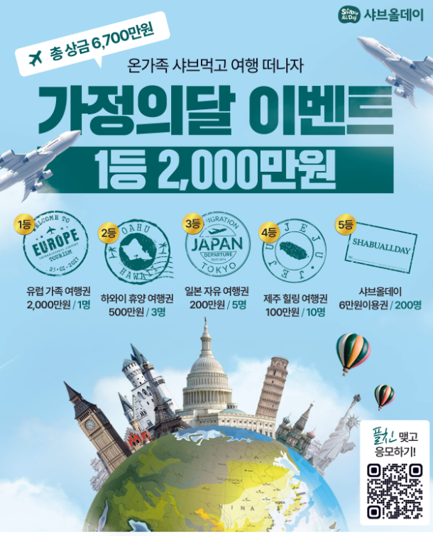 가정의달을 맞아 가족과 함께하는 특별한 외식, 그리고 여행의 기회까지! 샤브올데이에서 맛있는 추억을 만들고, 푸짐한 경품의 행운도 꼭 잡으시길 바랍니다.