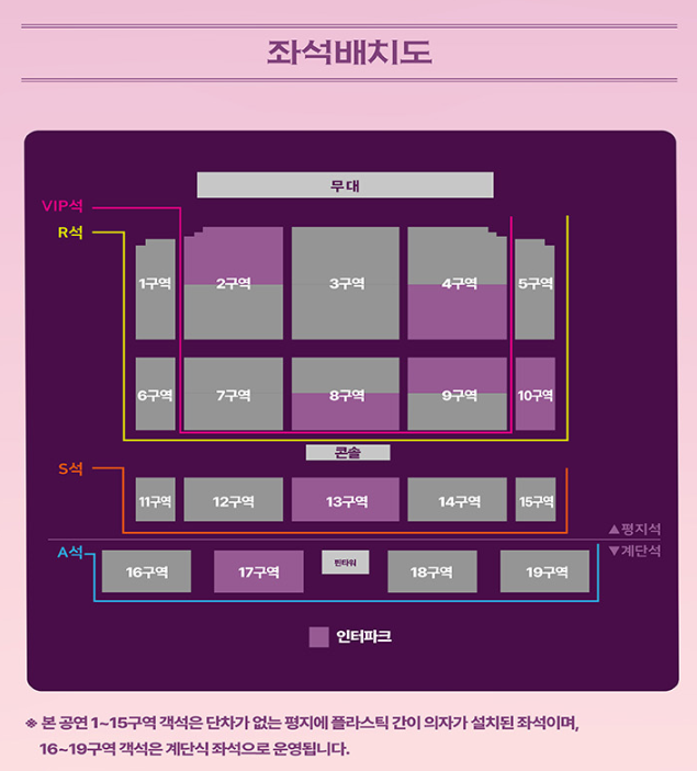 - 16~19구역: 계단식 좌석으로 운영됩니다.